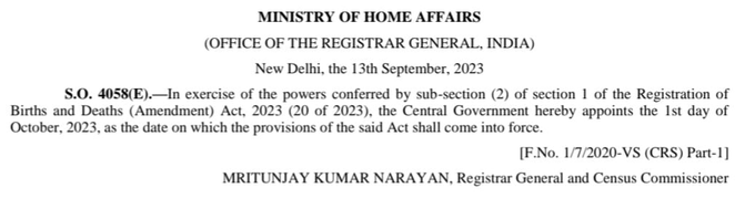नई दिल्ली। शैक्षणिक संस्थान में प्रवेश, ड्राइविंग लाइसेंस जारी करने, मतदाता सूची तैयार करने, आधार संख्या, विवाह के पंजीकरण या सरकारी नौकरी में नियुक्ति के लिए एकल दस्तावेज के रूप में जन्म प्रमाण पत्र के उपयोग की अनुमति देने वाला जन्म और मृत्यु का पंजीकरण (संशोधन) अधिनियम, 2023 एक अक्टूबर से लागू होगा.
