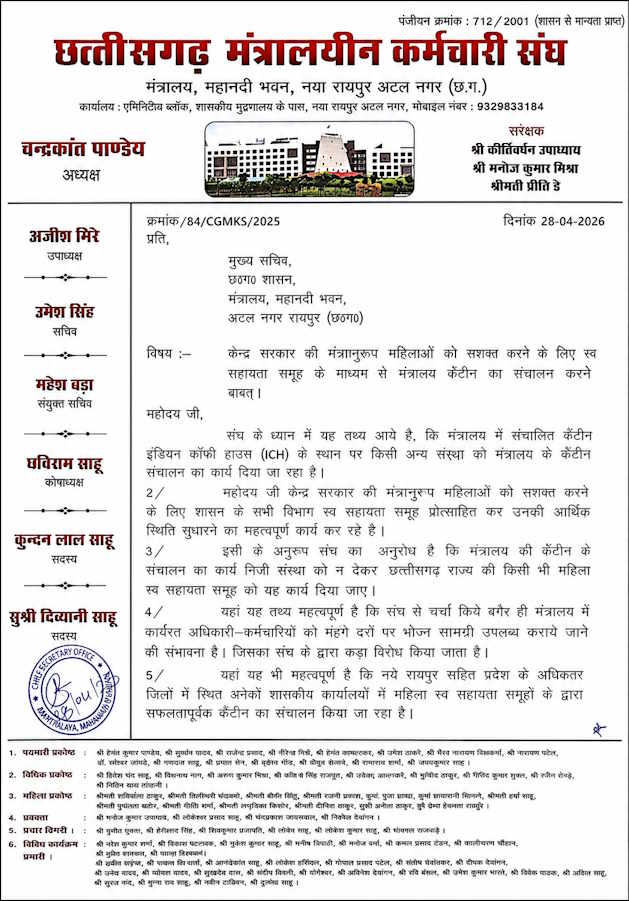 रायपुर। नवा रायपुर स्थित मंत्रालय (महानदी भवन) की कैंटीन व्यवस्था बदलने जा रही है. लंबे समय से कैंटीन संचालन इंडियन कॉफी हाउस (ICH) के माध्यम से बिना निविदा के किया जा रहा था. अब निविदा के जरिए एक एजेंसी का चयन कर कैंटीन संचालन की नई व्यवस्था लागू करने जा रही है, इस बीच मंत्रालयीन कर्मचारी संघ ने मुख्य सचिव को पत्र लिखकर महिला स्व-सहायता समूह के माध्यम से कैंटीन संचालित करने की मांग रखी है.
